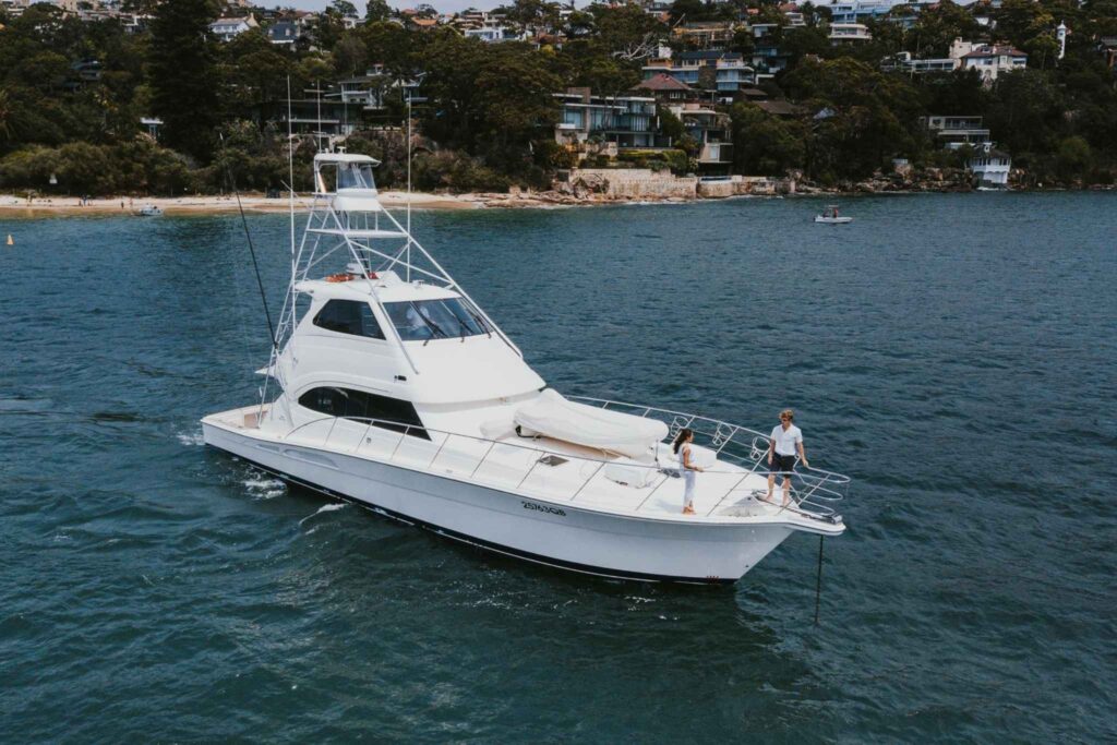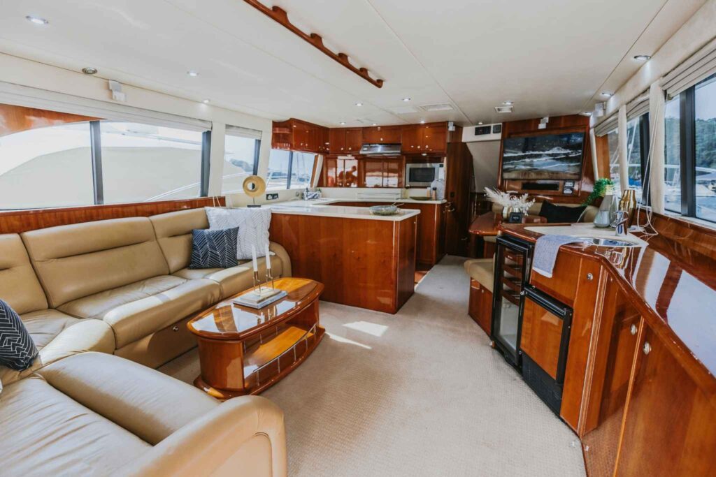 Onsite is a stunning and luxurious Riviera 58 Enclosed Flybridge with every comfort you need while on the water. Designed with the flexibility to host and accommodate a wide range of functions, activities, and family outings. This beautifully appointed vessel is equipped with wide walkaround side decks with handrails for added safety, polished timber finishes using gloss maple, and luxurious leather while boasting a large lounge area, coffee table, bar, dining table, TV & surround sound.